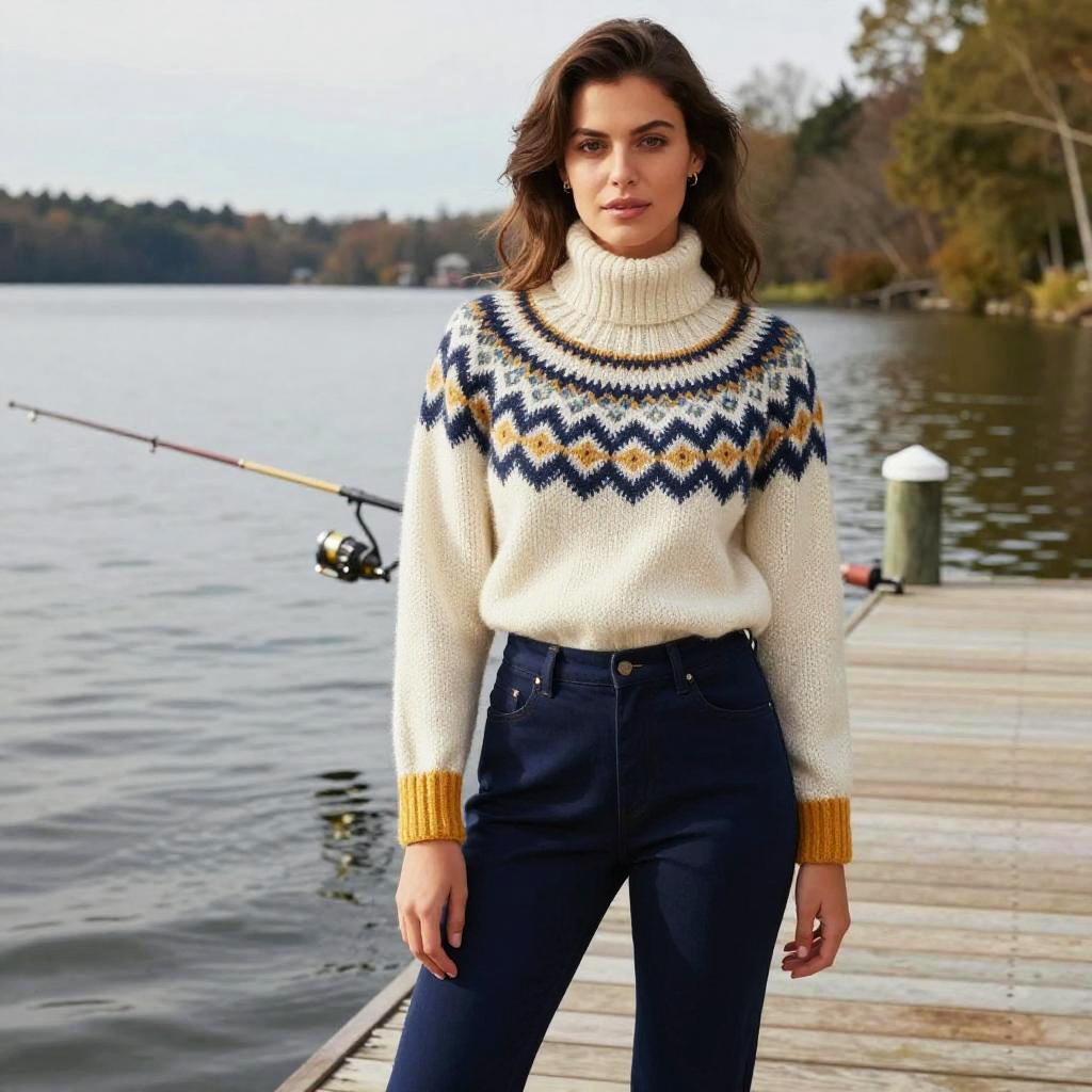 A toned woman in a chunky knit turtleneck sweater with a Fair Isle pattern and mustard cuffs, paired with high-waisted navy blue trousers, standing at a lakeside fishing dock, in a vibrant, painterly style. Sexy. Pretty face and beutiful eyes