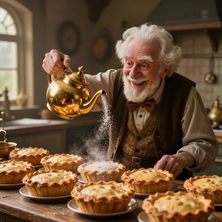 A whimsical wizard, adorned in a tall hat and apron, deftly slices into golden-latticed pies that seem to radiate warmth and wonder, inviting the viewer into a world where culinary magic meets timeless charm.
