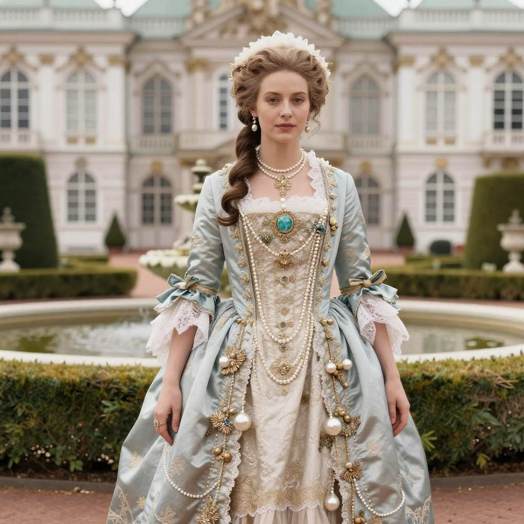 Photorealistic digital portrait of a young woman in an elaborate, light blue and gold Rococo-style gown with lace and pearl details, standing in front