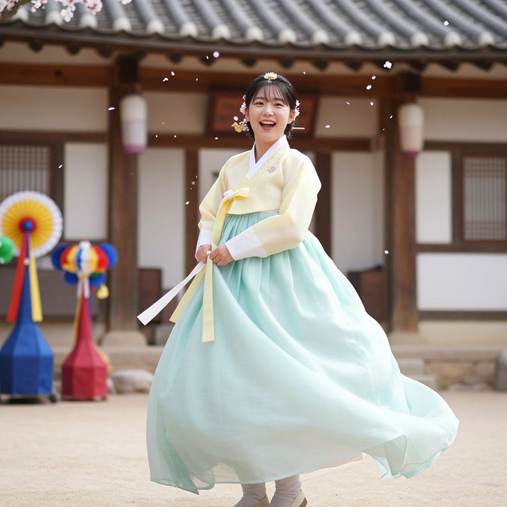 A joyful Korean hanbok woman with bright, laughing eyes and fair skin dances in a traditional temple courtyard during a festival, her pastel-colored hanbok—light yellow and mint green—flowing freely as she twirls, the petals of blossoms swirling around her like a soft breeze, the setting filled with colorful fans, lanterns, and festive decorations, radiating warmth, joy, and cultural grace.. The woman has big tits and cute face
