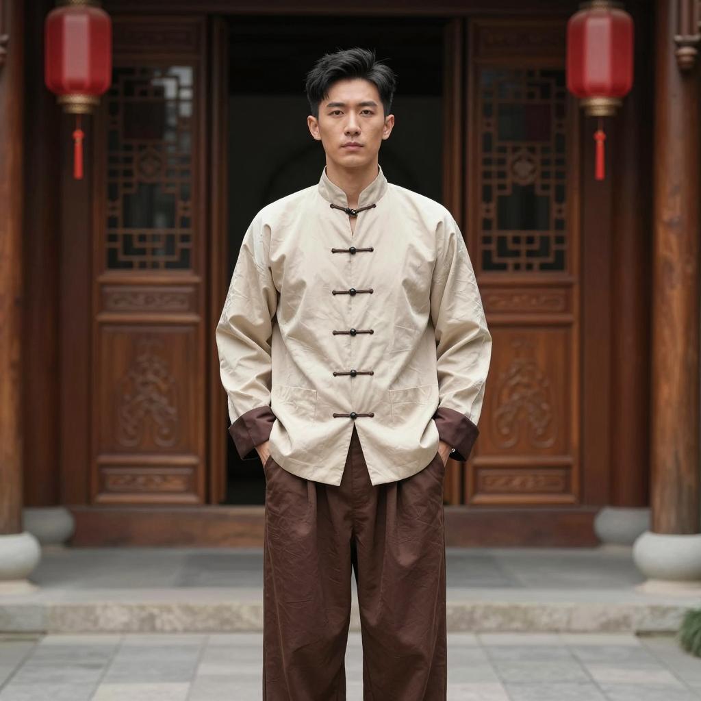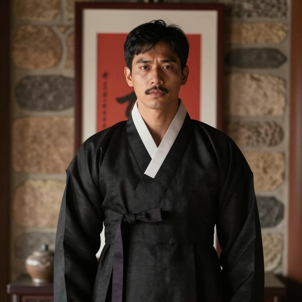 Outfit man costume, photograph of handsome Asian man, short black hair, serious expression, wearing beige traditional Korean hanbok with black belt, brown pants, standing in front of traditional Korean building, wooden lattice background, daytime, realistic style, standing pose, frontal view, natural light