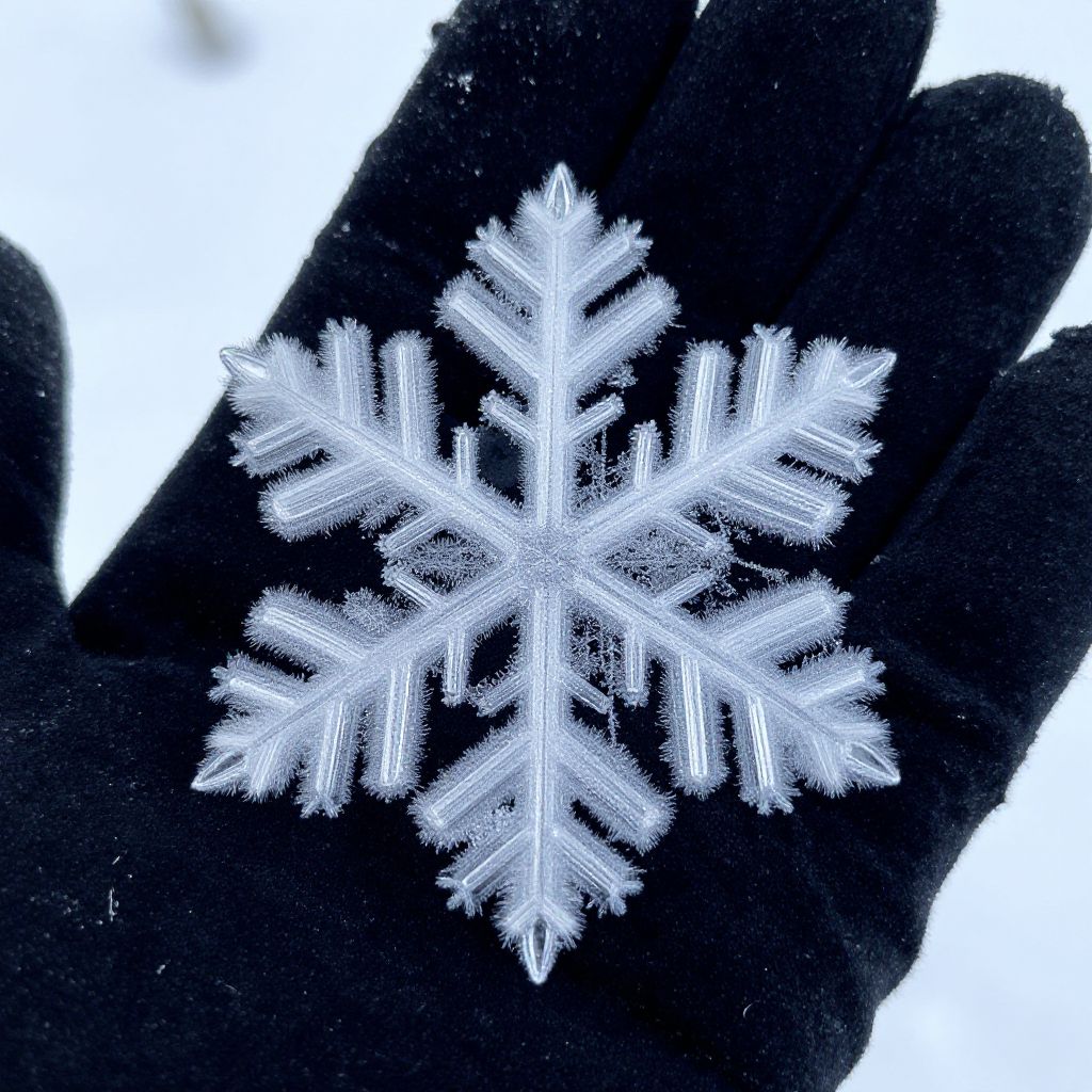 Photograph of a glowing, intricately detailed white snowflake resting on a black gloved hand against a snowy white background.