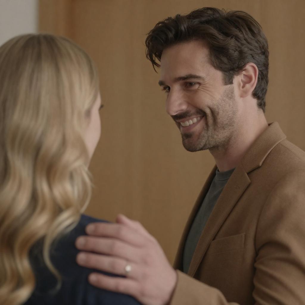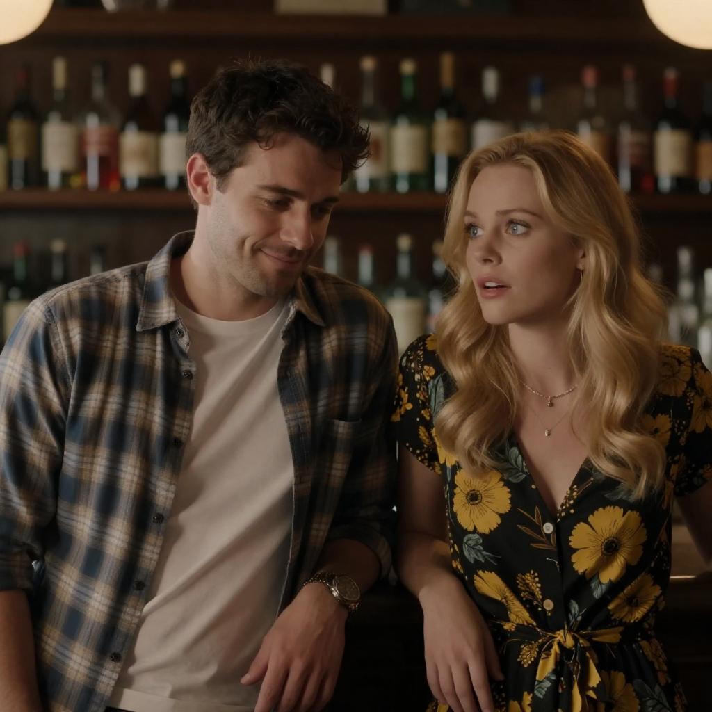 Photograph of two people in a dimly lit room. Blonde woman with shoulder-length hair, wearing a sleeveless top, extends her hand toward a seated man with short brown hair, wearing a patterned shirt. Man looks up at her. Background includes a lit, round object and green plants. Woman's expression is focused, man's is neutral.