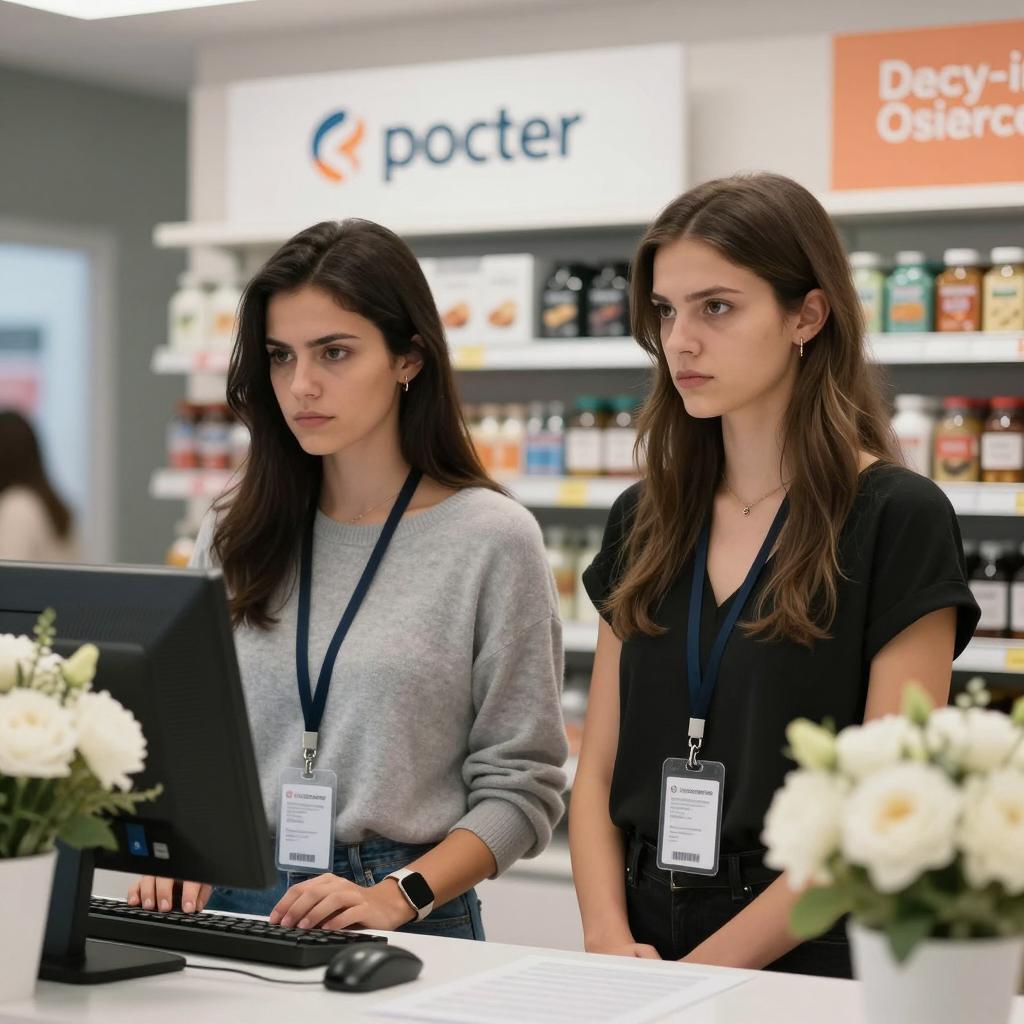 Two women in a store. Dark-haired woman in gray sweater with serious expression, brown-haired woman in black top with intense look. Both wear ID badges. Counter with white flowers, computer, and store signage in background.