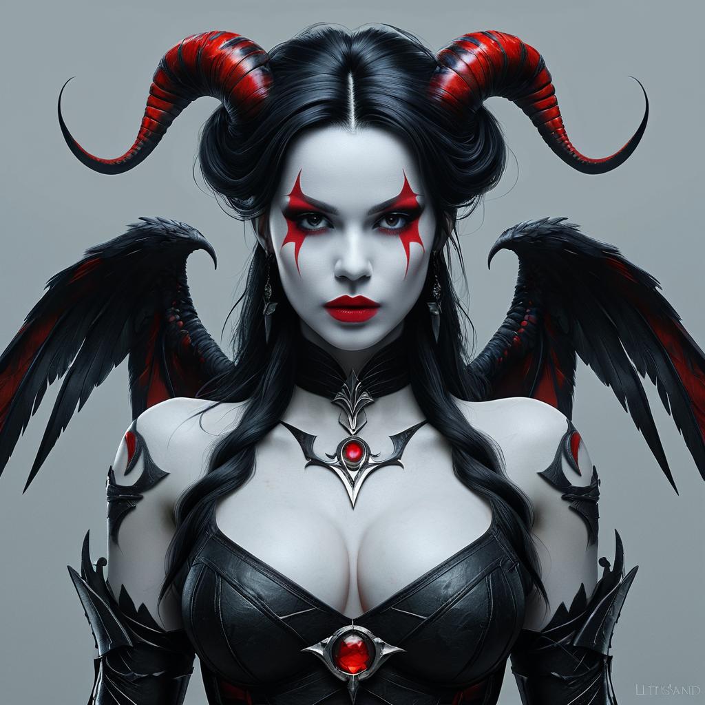 Digital art of a pale-skinned, red-lipstick demon woman with black hair, red star tattoos, black wings, red horns, and black