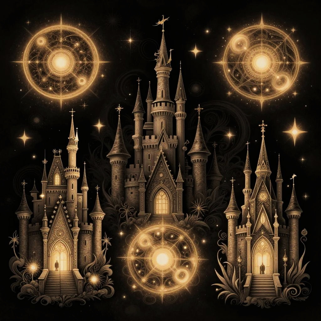 Fairytale magical tattoos depicting mystical castles and magical orbs, glowing in dark backgrounds, intricate linework fused with surreal fantasy elements, moody and enchanting