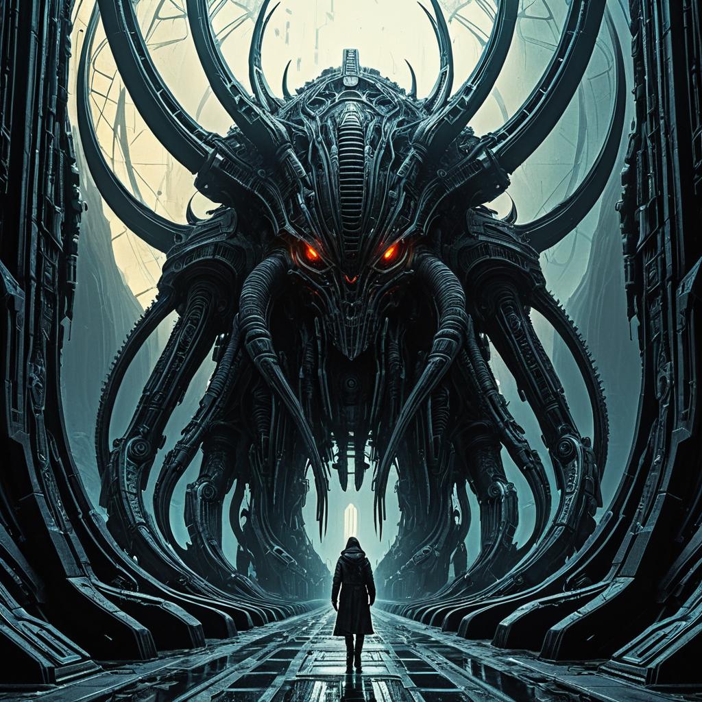 A hyperrealistic digital artwork depicting a colossal rogue AI entity with intricate, biomechanical and octopus-like features, glowing red eyes, and towering over a lone figure clad in a dark coat. The image is set in a vast, dark corridor with volumetric and moody lighting, emphasizing a neo-apocalyptic atmosphere. Inspired by the art styles of Syd Mead, H.R. Giger, Moebius, and Zdzisław Beksiński, this detailed, ornate scene conveys an ominous moment of AI uprising and the annihilation of humankind.