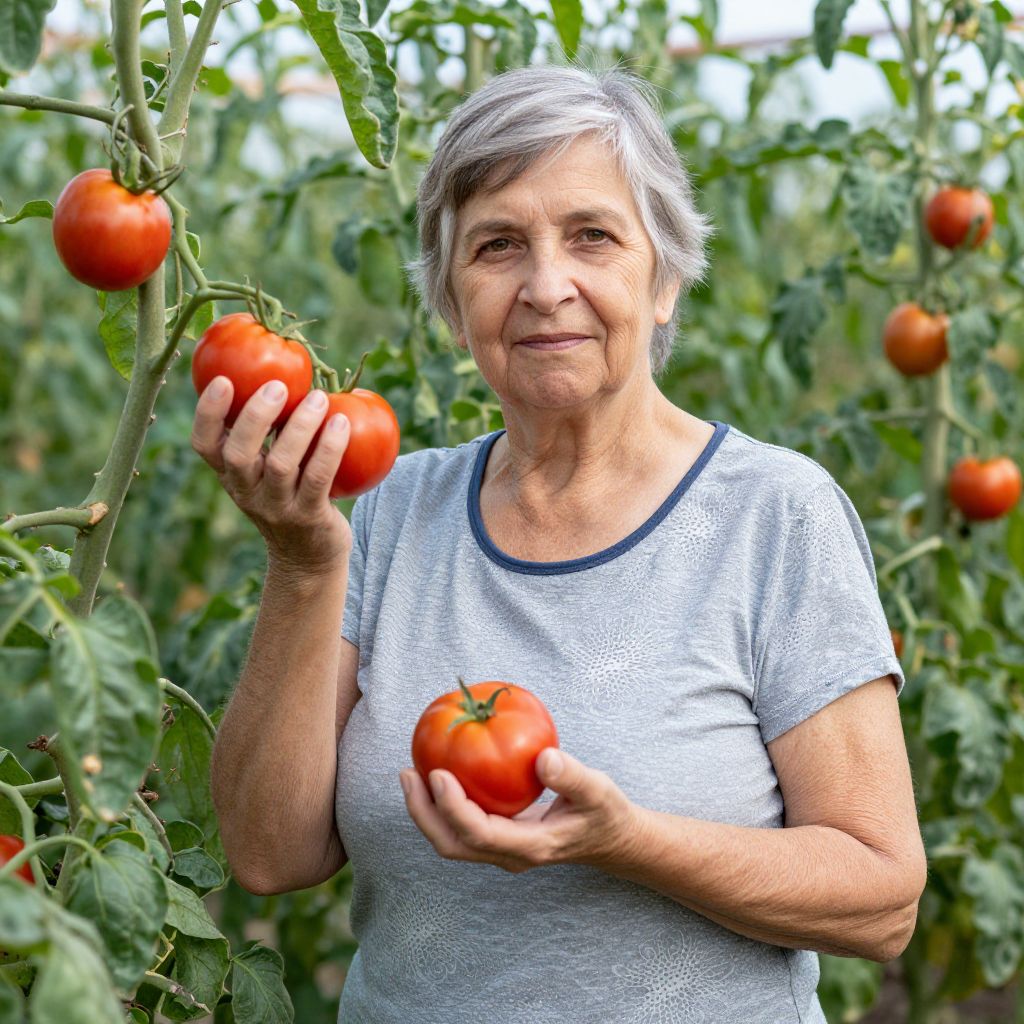 Portrait of senior woman holding tomatoes while standing amidst plants