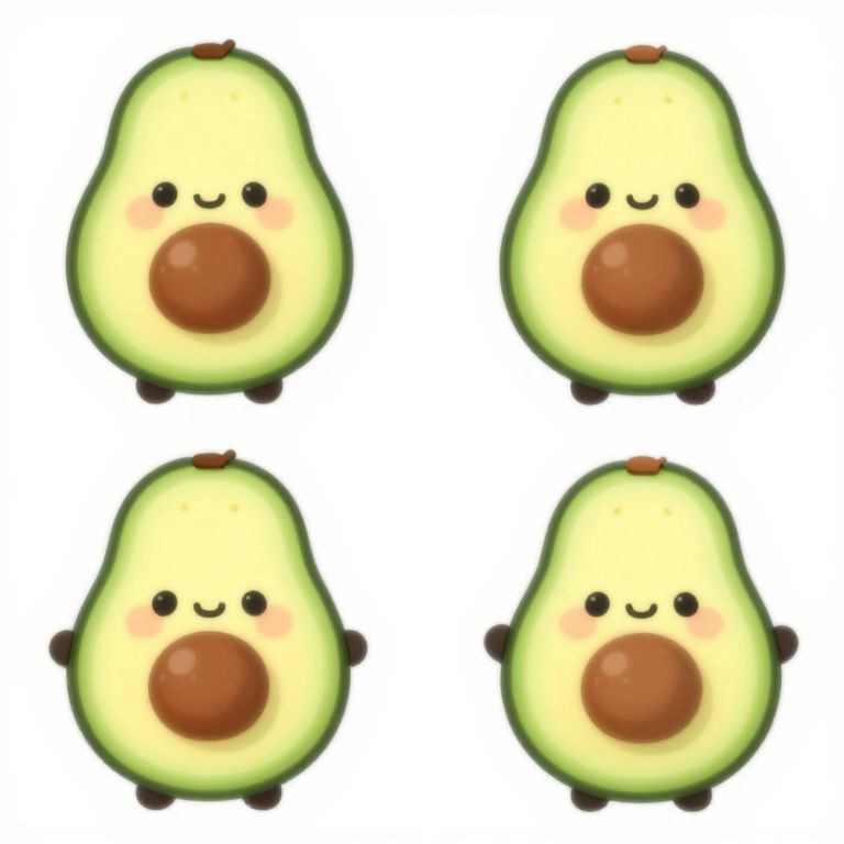 Four adorable kawaii avocado characters arranged in a grid, featuring whole avocados with cute faces and halved avocados showcasing their pits, all isolated against a clean background.