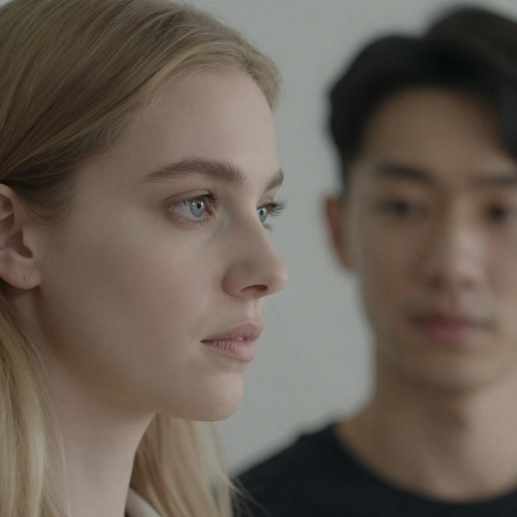 Close-up photograph of a serious young woman with light skin, green eyes, and straight blonde hair. A partially visible man's nose and mouth are on the right. Intense, focused facial expressions. Light skin tones dominate.