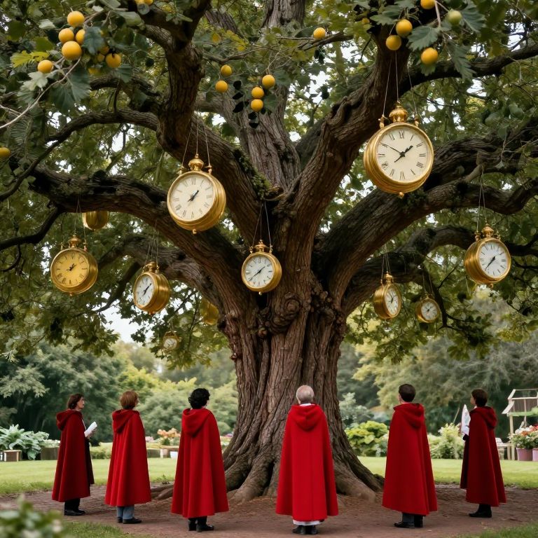 Time-keepers draped in crimson cloaks gather beneath a colossal, gnarled tree adorned with golden clocks suspended like fruit, harvesting moments from its timeless branches.