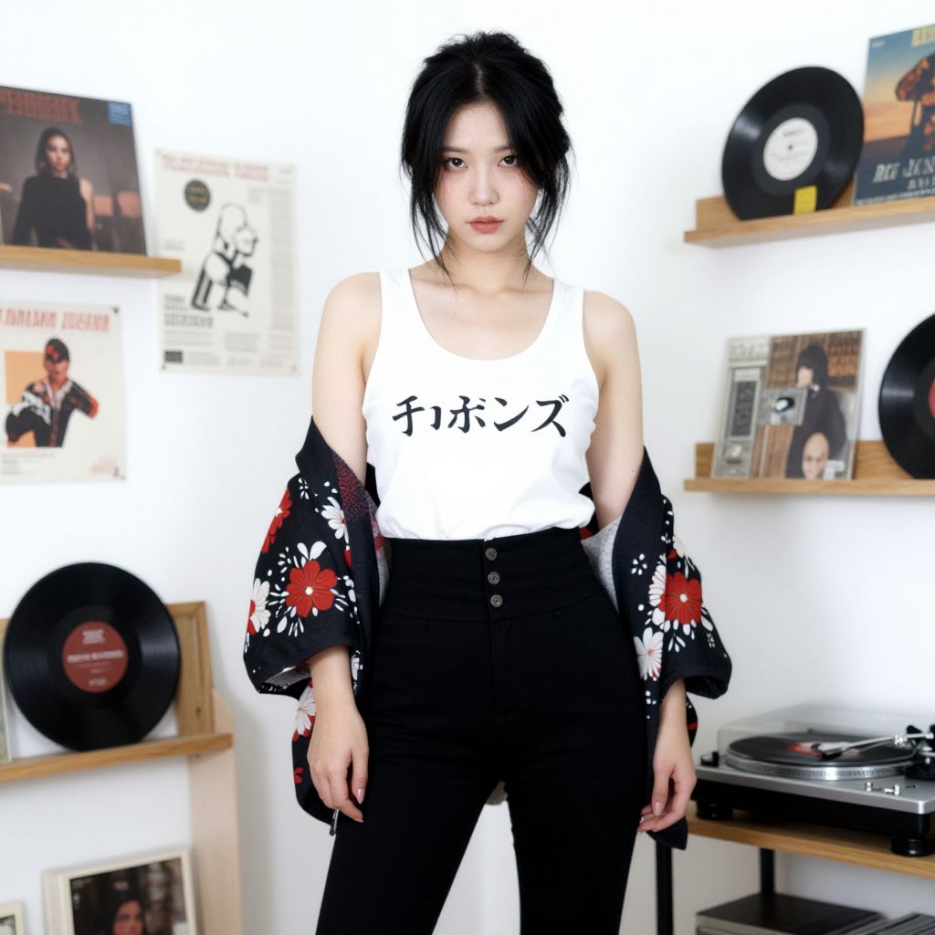 Photograph of an East Asian woman with pale skin and black hair in a casual updo, wearing a white tank top with black Japanese characters, black high-waisted pants, and a black kimono with red and white floral patterns. She stands in a brightly lit room with a white background, surrounded by vinyl records, posters, and a turntable on wooden shelves. She gazes directly at the camera with a neutral expression.