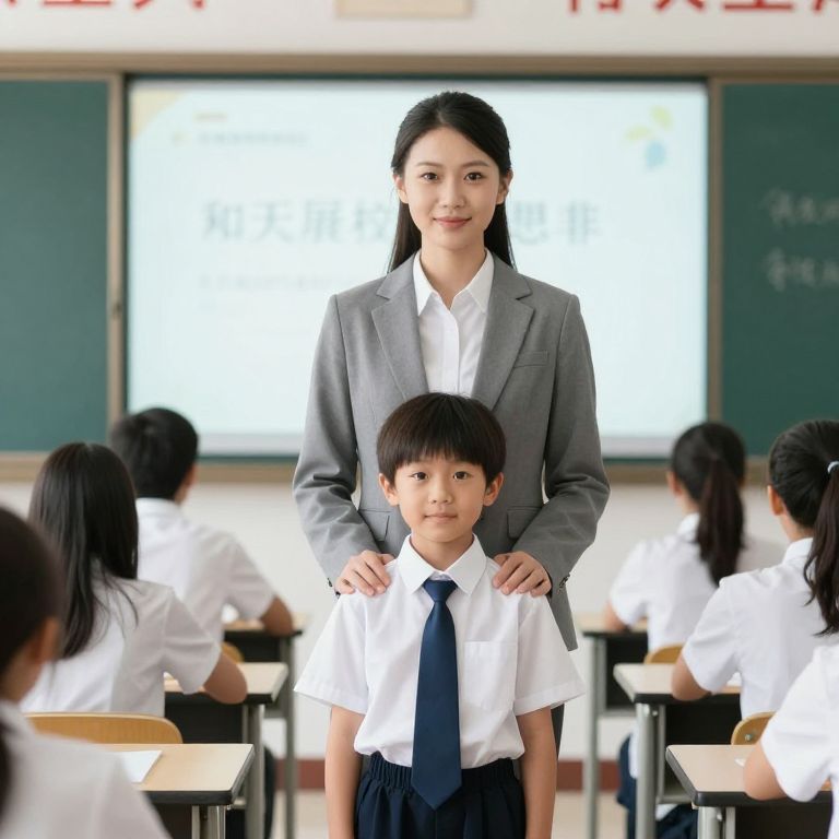 Teacher, young boy standing in a classroom wearing a tie