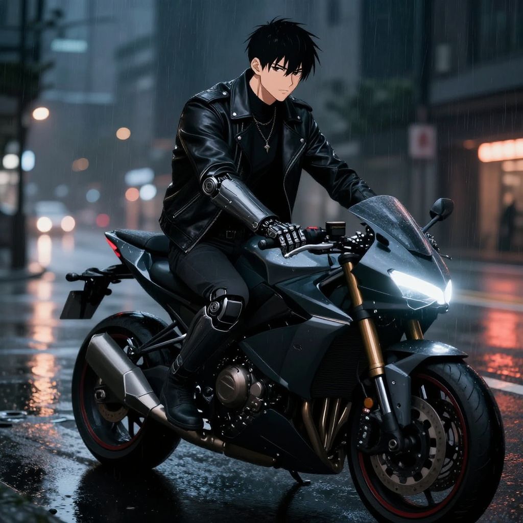 AI anime guy in a sleek leather jacket with robotic limbs, sitting on a futuristic motorcycle on a rainy street, city lights reflecting on wet pavement, anime style with sharp details, moody and cinematic lighting.
