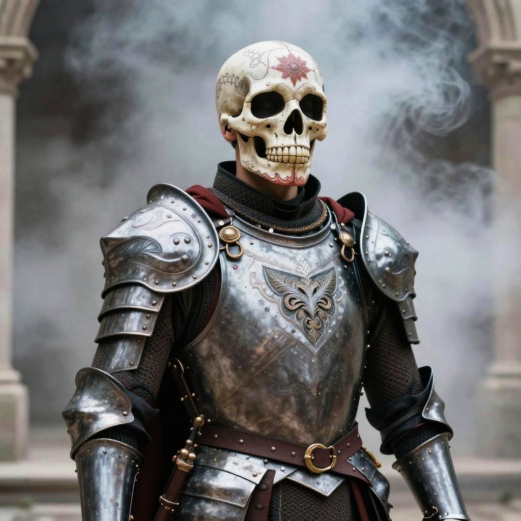 Realistic photo.Intricate armor, photo realistic, ultra details, natural light, ultra detailed portrait of a male bard, skeletal armor, skeleton skull face, la Catrina dia de los muertos, volumetric fog, Hyperrealism, breathtaking, ultra realistic, ultra detailed, cinematic lighting, highly detailed, breathtaking, photography, stunning environment, sexy realistic photo