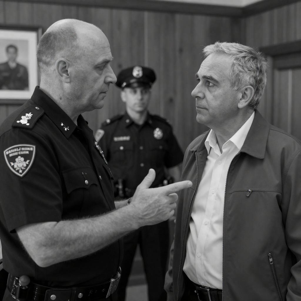 Photograph of two middle-aged men in a decorated room. The man on the left, with short gray hair, wears a dark coat and gray scarf, gesturing with his right hand. The man on the right, balding, wears a dark suit. Background includes a decorated Christmas tree, red and gold ornaments, and a lit wreath. A blurred woman with blonde hair stands in the background. Both men have focused expressions.
