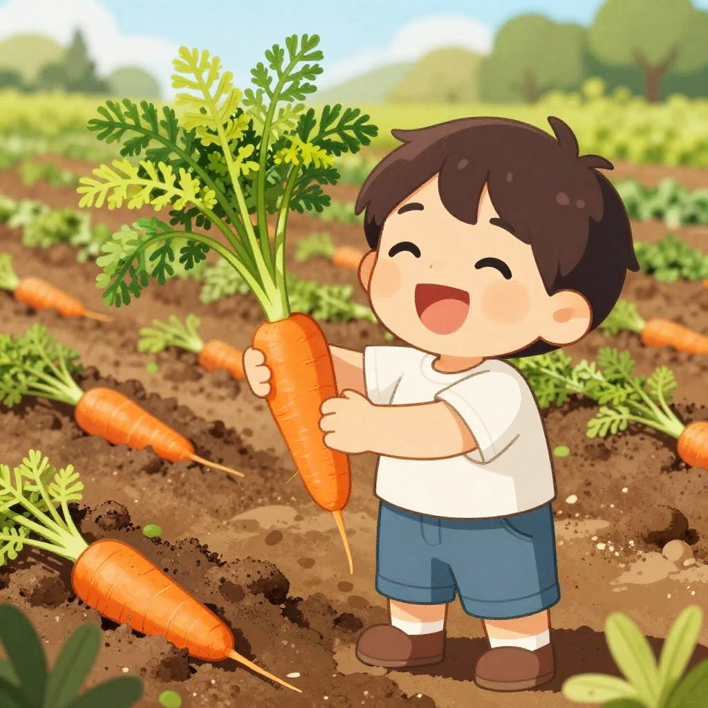 Carrot craving illustration showing a child with a joyful expression, holding a freshly picked carrot in a sunlit farm field, rich earth tones, detailed textures of soil and greenery, and a cheerful, heartwarming mood.