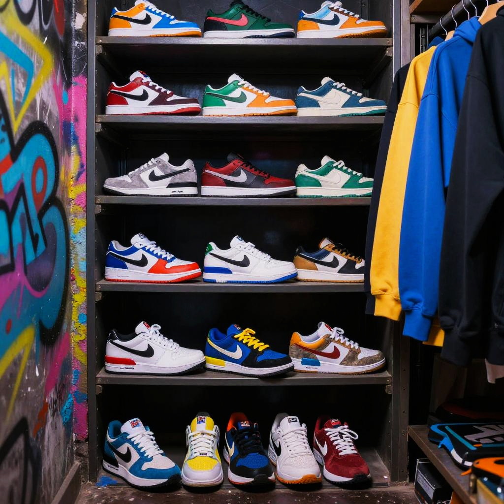 Sole stash of colorful sneakers artfully arranged in a secret urban closet, graffiti walls, vibrant streetwear style, moody neon lighting, high detail, fashion photography vibe