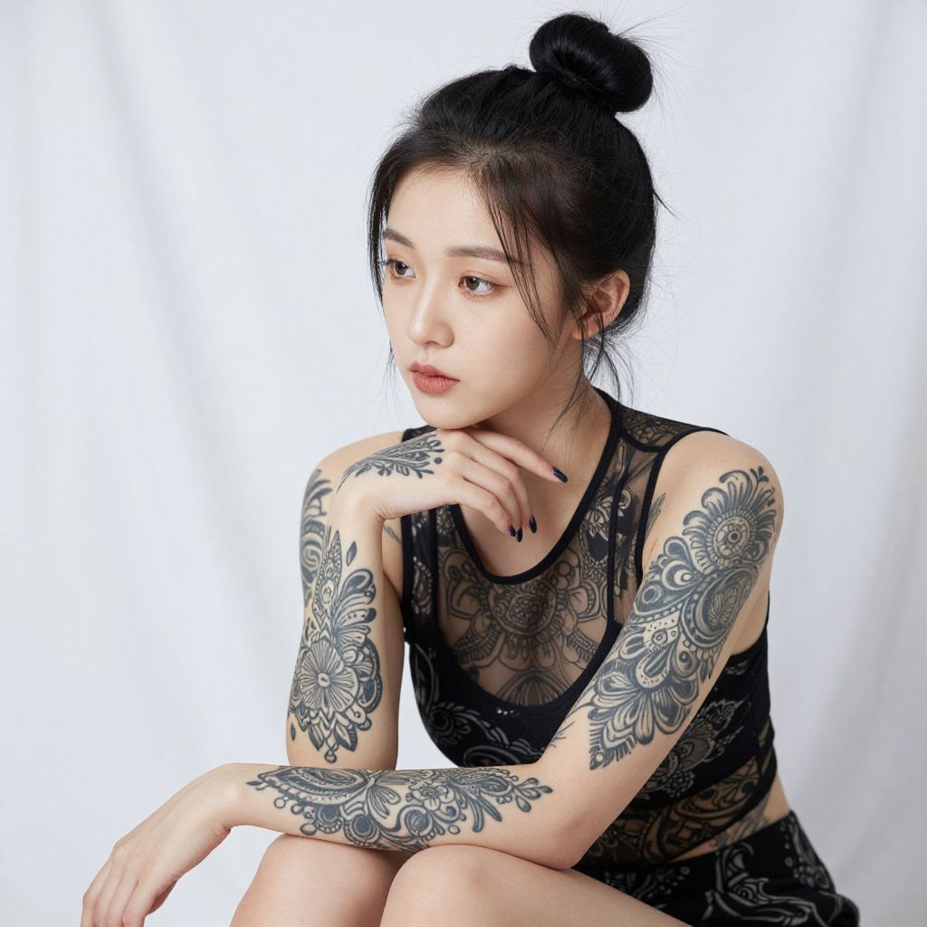Photograph of a young Asian woman with fair skin and dark hair in a high bun. She's sitting and looking slightly to the side with a thoughtful expression. She's heavily tattooed on both arms with intricate black ink designs, including floral and paisley patterns. She's wearing a black, sheer, patterned top. The background is a soft, white fabric. Her nails are painted dark.