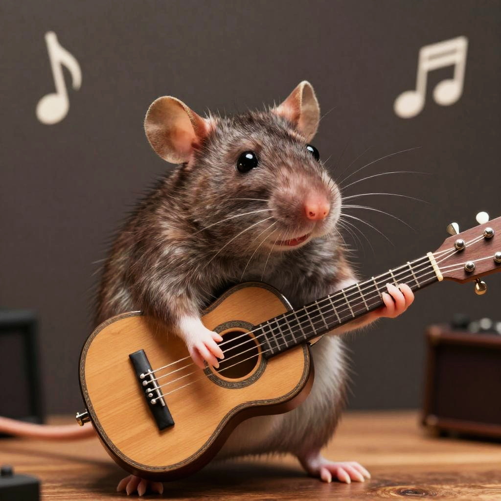 Close-up of a rat playing guitar on a small wooden stage, intricate details on the guitar strings, focused and passionate expression, realistic fur, soft spotlight highlighting the rat, background with subtle musical notes floating in the air, artistic and playful style