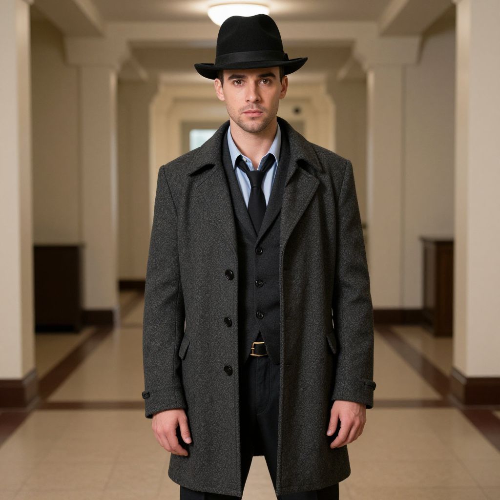 Noughties Costume, man standing in a hall wearing a hat and coat