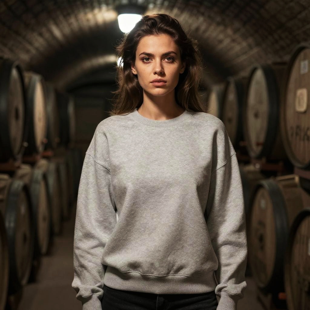 Woman in Sweatshirt in Wine Cellar
