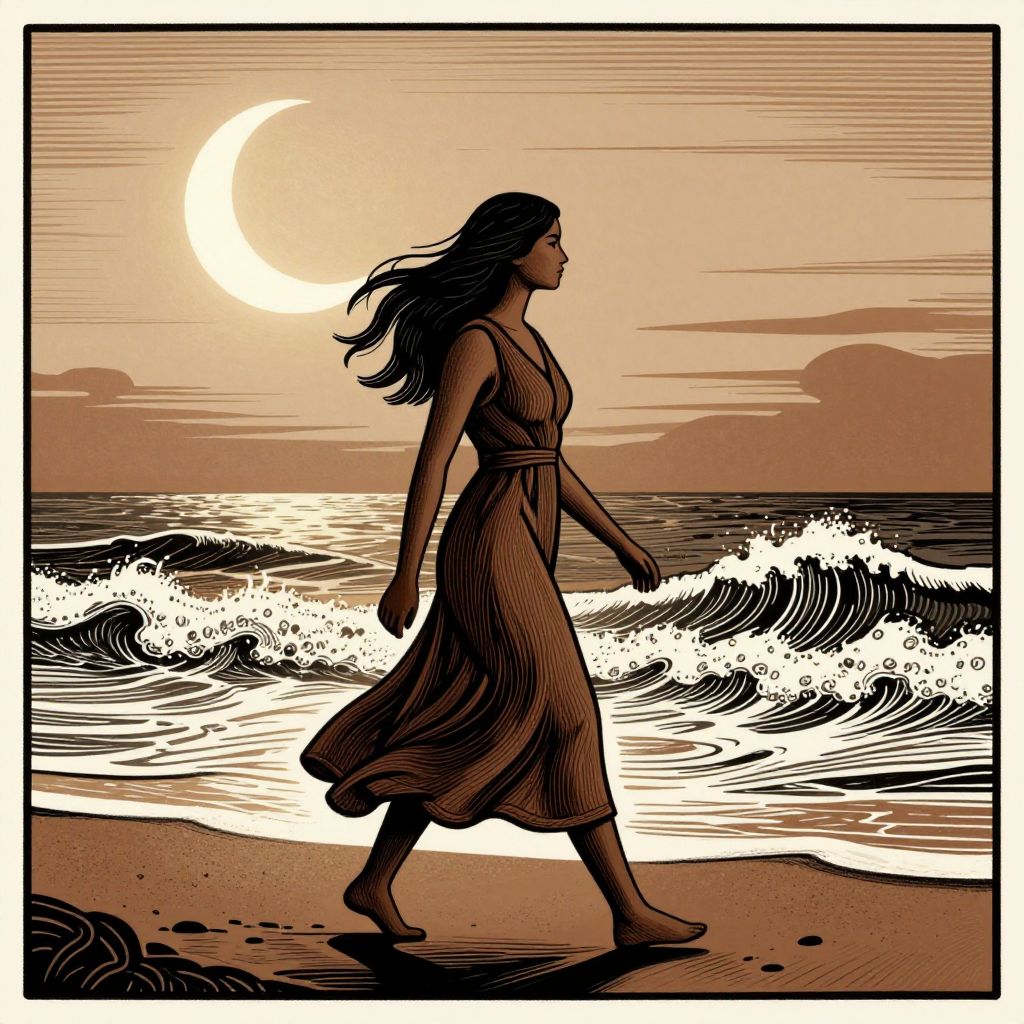 The image is a striking, balanced woodcut illustration featuring a woman walking along a beach shoreline at dusk. The woman, adorned in a flowing, draped garment, strides confidently towards the right side of the composition. Her long, dark hair flows freely, adding a sense of movement and grace to the scene. The crescent moon, glowing softly in the background, casts a warm, ethereal light over the scene, enhancing the tranquil atmosphere. The waves, depicted with dynamic, swirling lines, crash against the shore, creating a sense of rhythm and energy. The interplay of light and shadow, along with the rich, earthy tones of brown and beige, creates a harmonious balance between the woman, the sea, and the sky. The overall composition is carefully arranged, with the woman positioned centrally, the waves to her right, and the moon above, creating a visually pleasing and balanced arrangement.