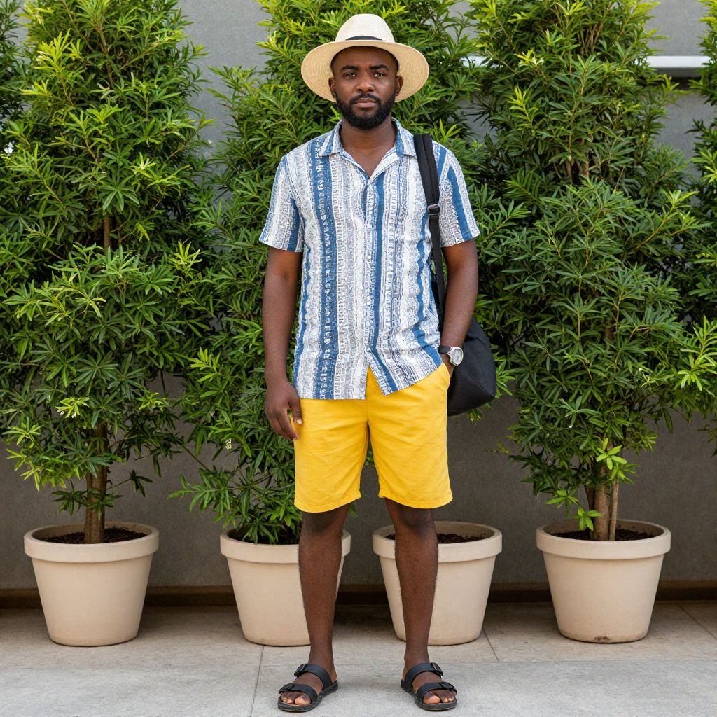Summer travel costume, 1boy, male focus, facial hair, solo, shorts, beard, hat, full body, short hair, shirt, mature male, sandals, thick eyebrows, outdoors, plant, potted plant, bag, watch, mustache, wristwatch, dark-skinned male, looking at viewer, bara, dark skin, standing