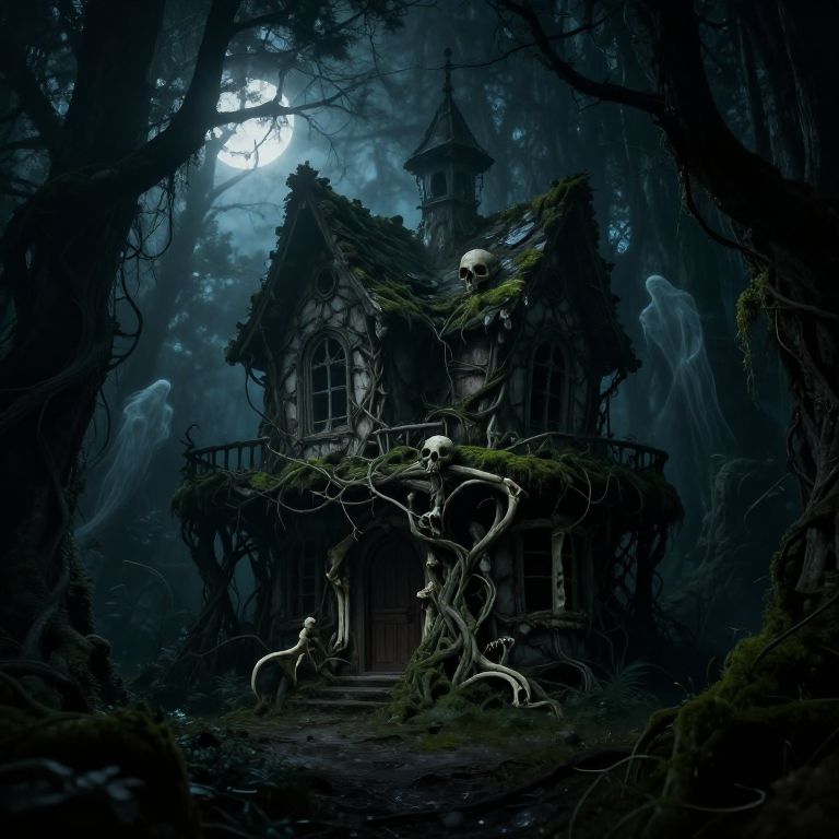 Dark, eerie forest scene with a decrepit, moss-covered house, ghostly figures, twisted vines, and a glowing full moon overhead. Digital artwork