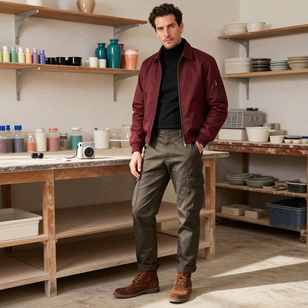 A man, burgundy bomber jacket, black fitted turtleneck, dark khaki cargo pants, brown suede desert boots, sophisticated streetwear, sunlit workshop, shelves of colorful glazes, clay dust motes in the air, polaroid instant camera style, relaxed expression. Man has masculine face and piercing eyes