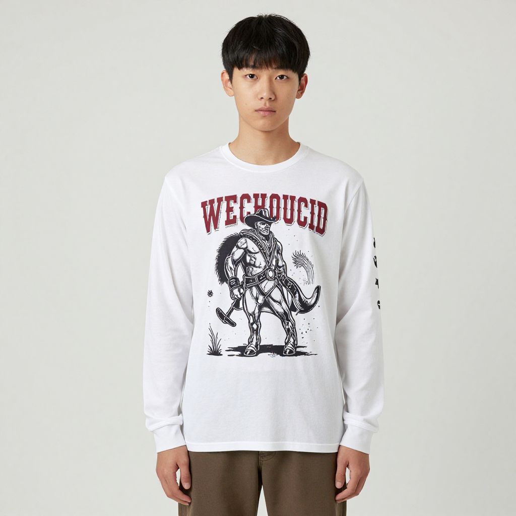 "graphic long sleeve shirts, male focus, 1boy, solo, black hair, pants, brown pants, simple background, realistic, shirt, looking at viewer, print shirt, white background, standing, cowboy shot, white shirt, short hair, black eyes, closed mouth, arms at sides Realistic photo of casual sexy person with pretty face"