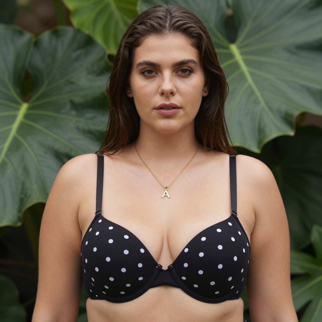 Photograph of a woman with fair skin and long brown hair, wearing a black polka dot bra, large breasts, and a gold necklace with an "A" pendant. She has a neutral expression. Large green leaves in the background.