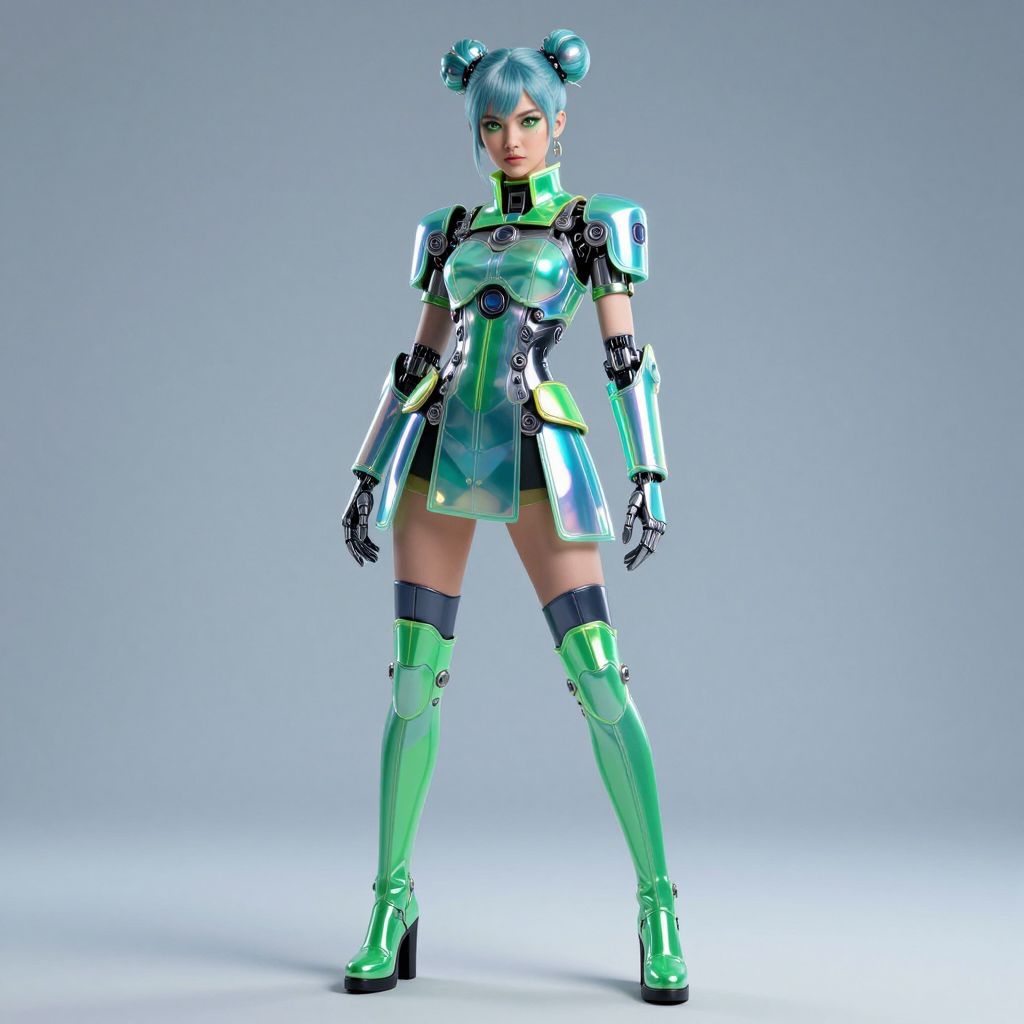 The image showcases a full-body character concept art of a futuristic, manga-inspired fashion model girl. She is adorned in a detailed, green and aqua holographic iridescent plastic futuristic outfit, featuring intricate designs and textures. The character's face is beautifully detailed, with striking green and aqua makeup that complements her vibrant attire. Her hair is styled in space buns, adding to her unique and stylish appearance. The outfit includes a high-collared top with shoulder pads, metallic gloves, and thigh-high boots, all integrated with various mechanical and cybernetic elements. The overall composition is dynamic, with the character positioned in a confident stance, facing forward and slightly turned to the side, allowing a comprehensive view of her futuristic ensemble. The background is a soft, gradient blue, which enhances the visual impact of the character's colorful and detailed outfit.