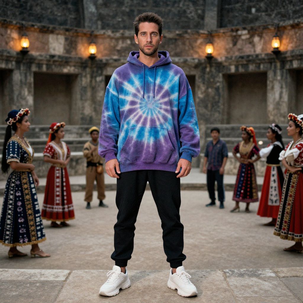 A man, oversized tie-dye hoodie in vibrant blues and purples, black tapered track pants, chunky white sneakers, ancient stone amphitheater, flickering lanterns, eastman film stock, relaxed expression, surrounded by traditional dancers in ornate costumes. Man has masculine face and piercing eyes