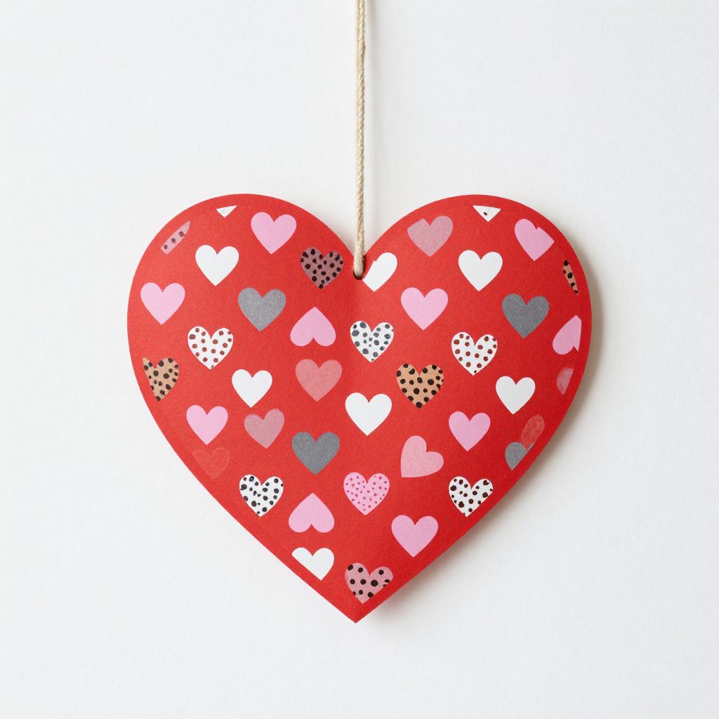 Suspended heart-shaped decoration crafted from vibrant red paper adorned with a playful pattern of smaller hearts in shades of pink, white, gray, and leopard print, elegantly hung by a thin rope against a clean white background.