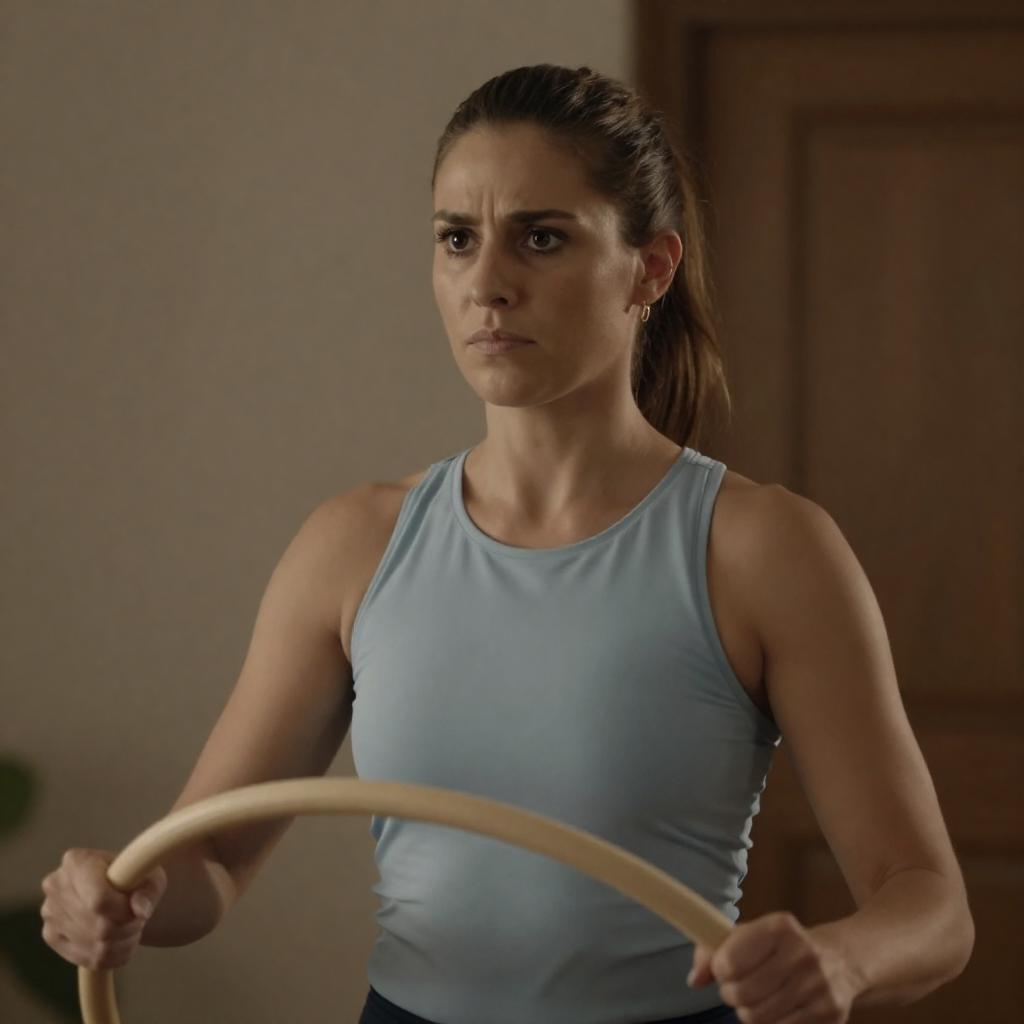 Photograph of a woman with fair skin, brown hair in a ponytail, wearing a light blue sleeveless top, gold earrings, serious expression, holding a wooden hula hoop, dimly lit indoor background with warm light, blurry wall and door in background.