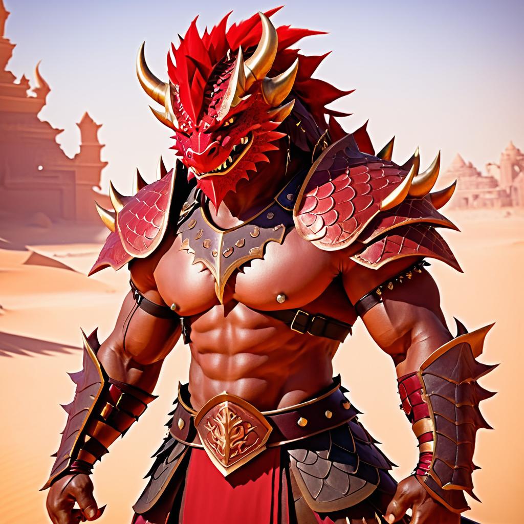 Portrait of a muscular dragonborn warrior with crimson scales and fierce grin, wearing detailed spiked armor inspired by fantasy art. The warrior holds a weapon and stands in a desert environment with rocky formations in the background. The image captures intricate armor design with horns and spikes, emphasizing strength and mythical elements.