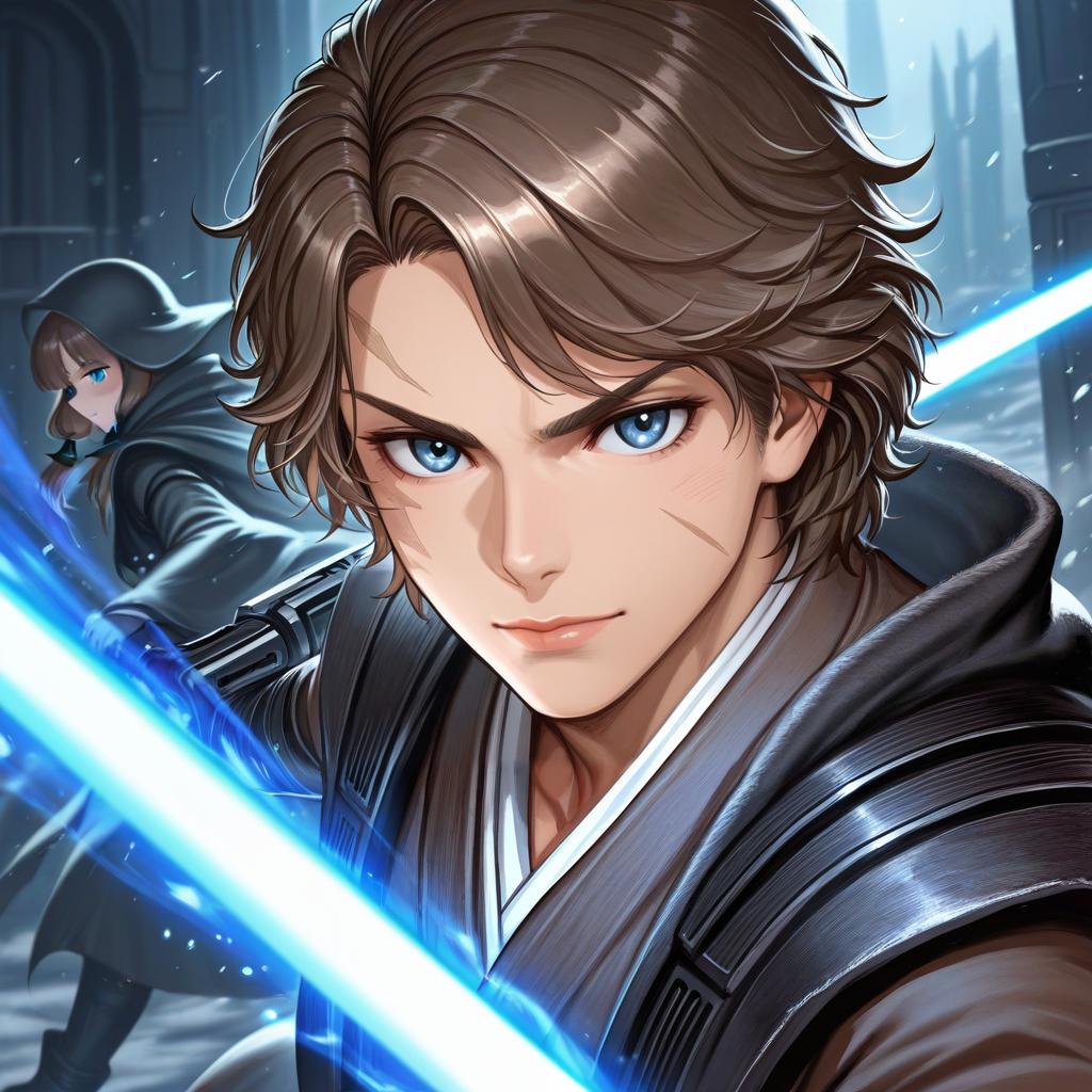 Anime-style illustration of a young Anakin Skywalker from Star Wars, featuring blue eyes, short brown hair, and a scar across his eye. The character is depicted holding an active blue lightsaber, wearing Jedi robes, set against a dynamic background with glowing light streaks.