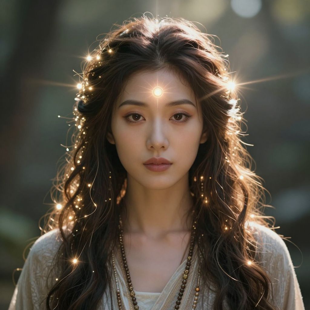 Photograph of an East Asian woman with long, wavy, dark brown hair, wearing a light, textured, beige top. Her face is centered, with large, almond-shaped brown eyes and a serene expression. Her hair is adorned with glowing, star-like lights, primarily around her forehead and hair strands. The background is blurred with green and dark tones, suggesting an outdoor, forest-like setting. Soft sunlight filters through, creating a magical, ethereal atmosphere. The image is highly detailed, with a focus on the woman's calm, mystical presence and the glowing lights in her hair.