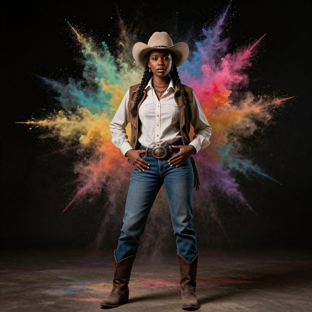 A 25yo gorgeous black woman, in a rugged cowboy attire, dark neutral background, Vintage western look, Gritty texture, piecemaster, cinematographic style, dark mood, dramatic lighting and shadow, detailed skin, 8k, (High quality Professional Photo:2) (Ultrarealistic:2)a woman in a cowboy outfit and hat posing for a picture with her hands on her hipster belt and jeans and boots on her hip, with a black background, and a dark background, a black backdrop, a dark, a black background, 1girl, solo, cowboy hat, hat, denim, pants, shirt, belt, cowboy western, long hair, jeans, cowboy shot, realistic, breasts, braid, white shirt, looking at viewer, fringe trim, hand on hip, brown hair, brown belt, collared shirt, long sleeves, vest, nose, buckle, medium breasts, lips, standing, belt buckle, leather, brown eyes, closed mouth, buttons, leather belt, necklace, jewelry, jacket, a brightly colored powder is flying in the air, colourful explosion, an explosion of colors, color explosion, colorful explosion, explosion of color, explosion of colors, color pigments spread out in air, magical sparkling colored dust, burst of powders, color ink explosion, colorsmoke, colorful 8 k, explosive colors, colorful picture, colorful photo, color dispersion, colorful, black background, abstract, paint splatter, no humans, rainbow gradient, rainbow order, simple background, ultra-realistic smooth edges, ((antialiasing smooth edge quality:1.2)), anti-aliasing, MSAA, FXAA, TAA