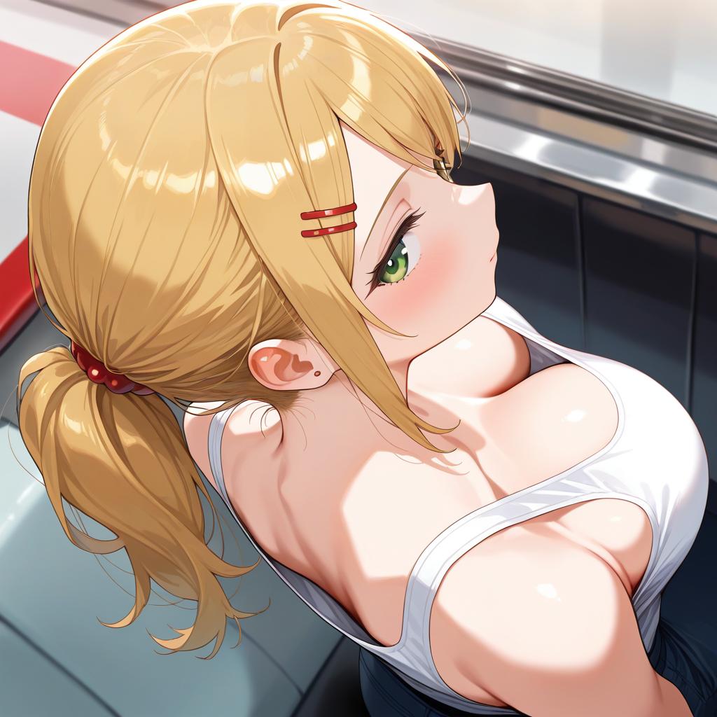 1girl, ponytail with bangs, brown eyes, golden blonde, hair ornament, ponytail, hairclip, diner, large breasts, downblouse from behind, downblouse, from behind, tank top , white tank top, cleavage, from above, nape, head down, looking at viewer, looking back, looking up, sideways glance