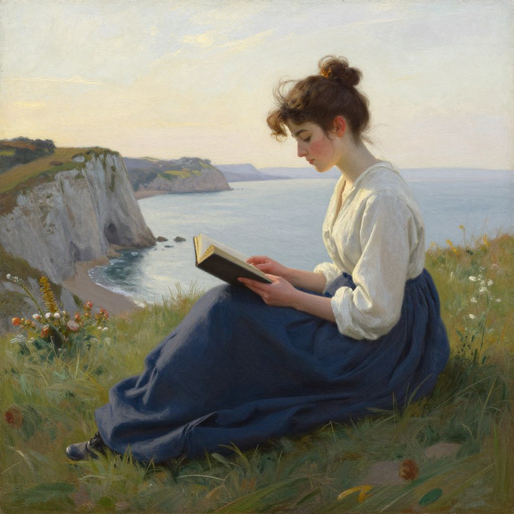 Realistic painting of a fair-skinned woman with brown hair in a bun, wearing a blue dress and white blouse, reading on a grassy cliff