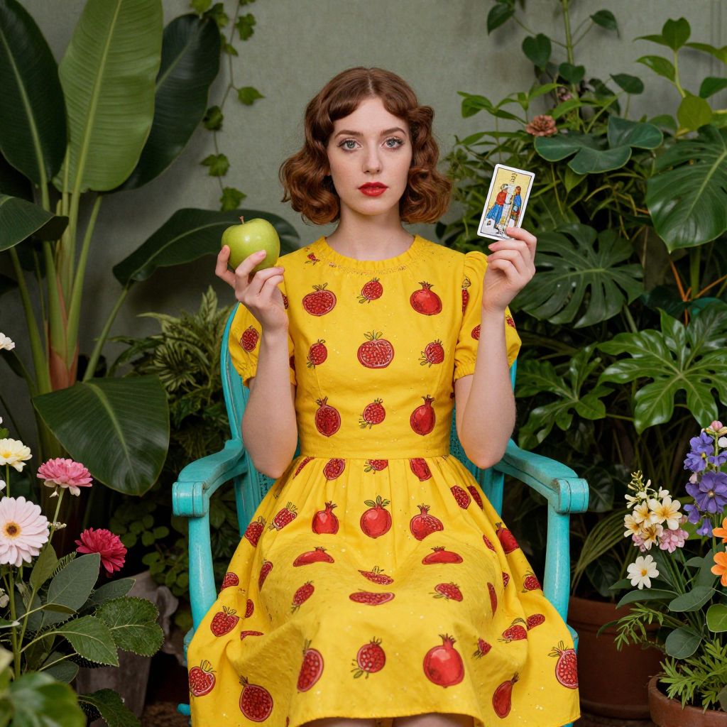 A woman in a yellow dress with a pomegranate pattern sits on a turquoise chair, holding a green apple and a tarot card, surrounded by lush green plants and flowers, in a surreal, hyper-realistic style reminiscent of Wes Anderson and Tim Walker.
