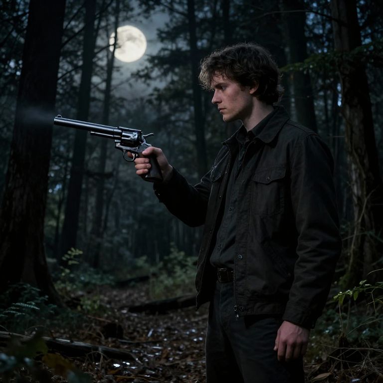 Photograph of a young man with curly brown hair standing in a dark, dense forest at night. He's wearing a black jacket and pants, aiming a silver revolver with his right hand. The full moon shines brightly in the background, illuminating the tall trees and creating a stark contrast with the dark forest. The ground is covered in leaves and small plants. The man's expression is focused and serious. The image has a dramatic, moody atmosphere with cool blue and dark tones.