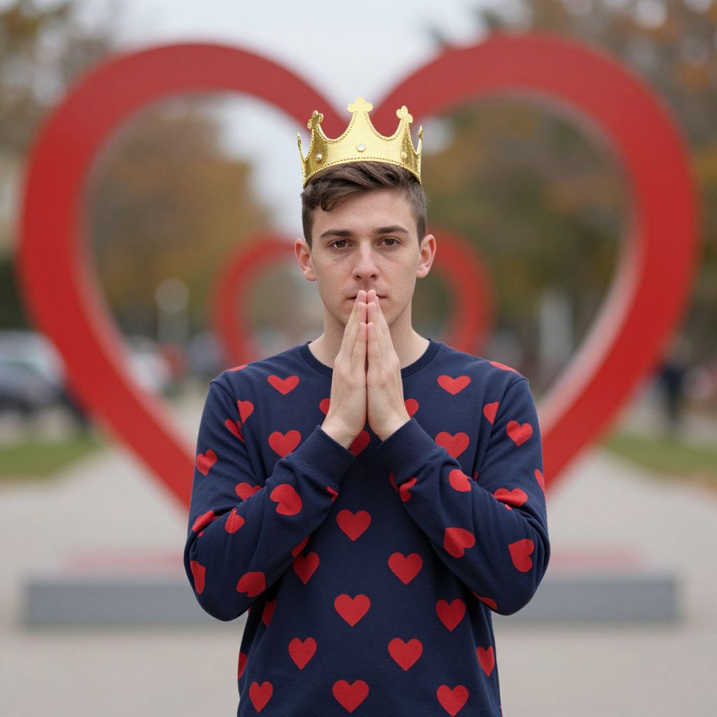 King hearts halloween, 1boy, crown, male focus, solo, heart, blurry background, looking at viewer, blurry, long sleeves, outdoors, heart print, closed mouth, own hands together