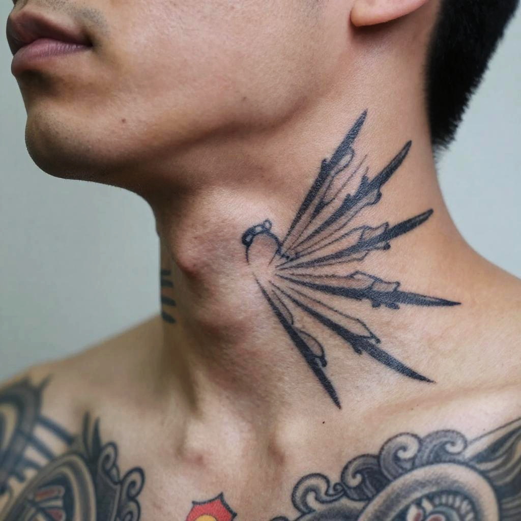 Close-up of a man with a quan neck tattoo, showcasing fine black ink patterns with subtle red accents, combining traditional and modern tattoo art styles, soft focus background, high detail on skin texture and ink strokes.