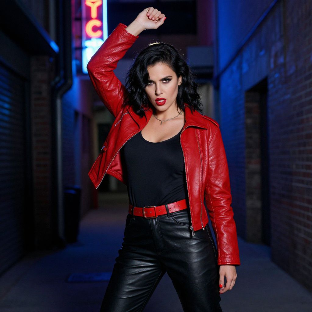Photograph of a woman with wavy brown hair, wearing black leather jacket, sunglasses, and red lipstick, standing in front of graffiti-covered wall.