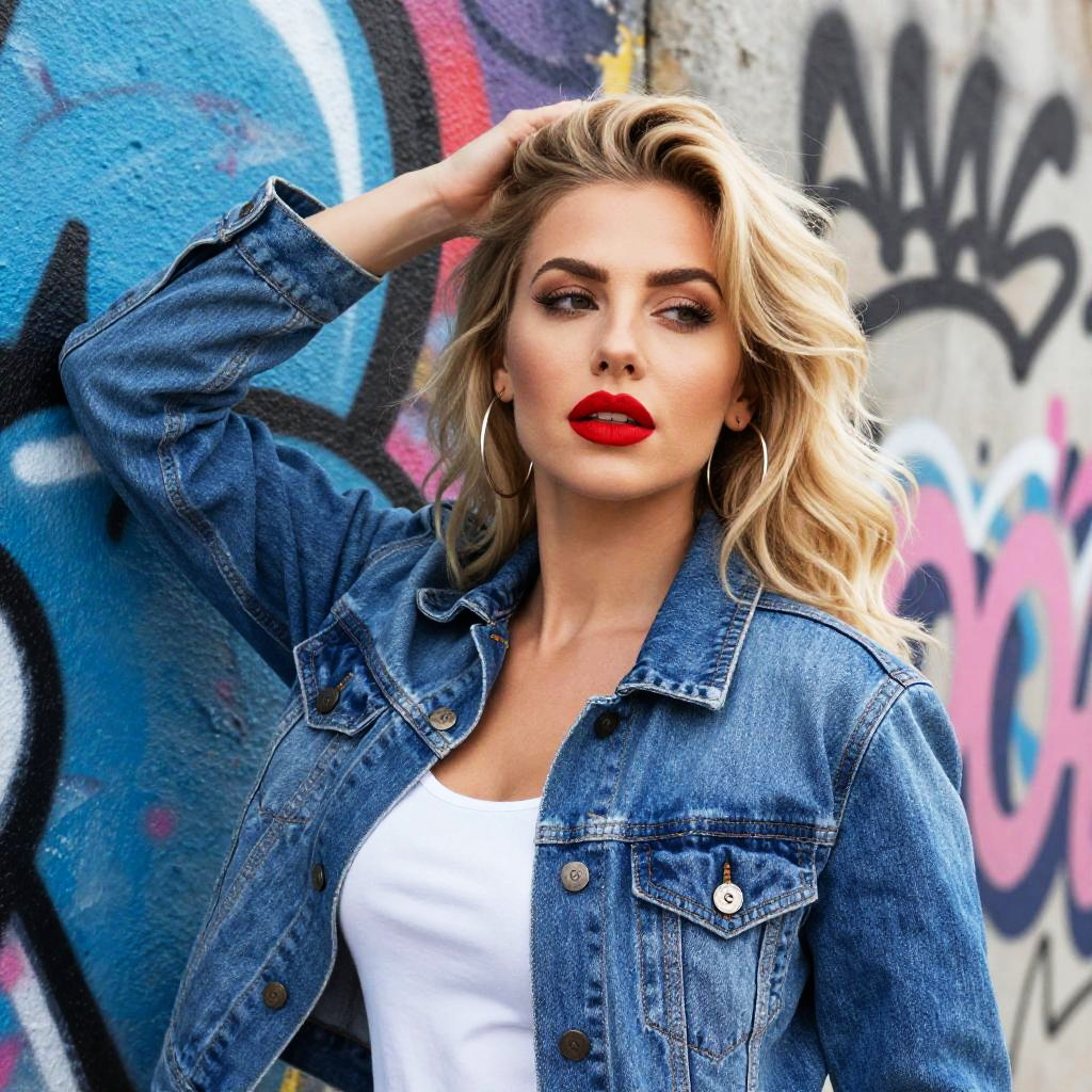 Photograph of a woman with wavy, shoulder-length brown hair, wearing dark sunglasses, a black leather jacket with silver zippers, and a silver necklace. She has pink lipstick and is adjusting her sunglasses with her right hand. The background features a graffiti-covered concrete wall with colorful tags and designs in shades of blue, red, yellow, and white. She stands on a narrow, urban sidewalk, and the overall style is edgy and urban. The image has a vibrant, street-style aesthetic.