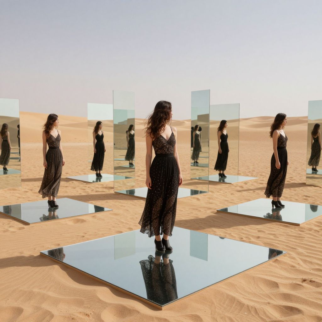 In a vast desert, a woman stands amidst an array of mirrors, each reflecting her own form in perfect symmetry, creating an endless, surreal tableau where past and present merge into a hauntingly beautiful illusion.