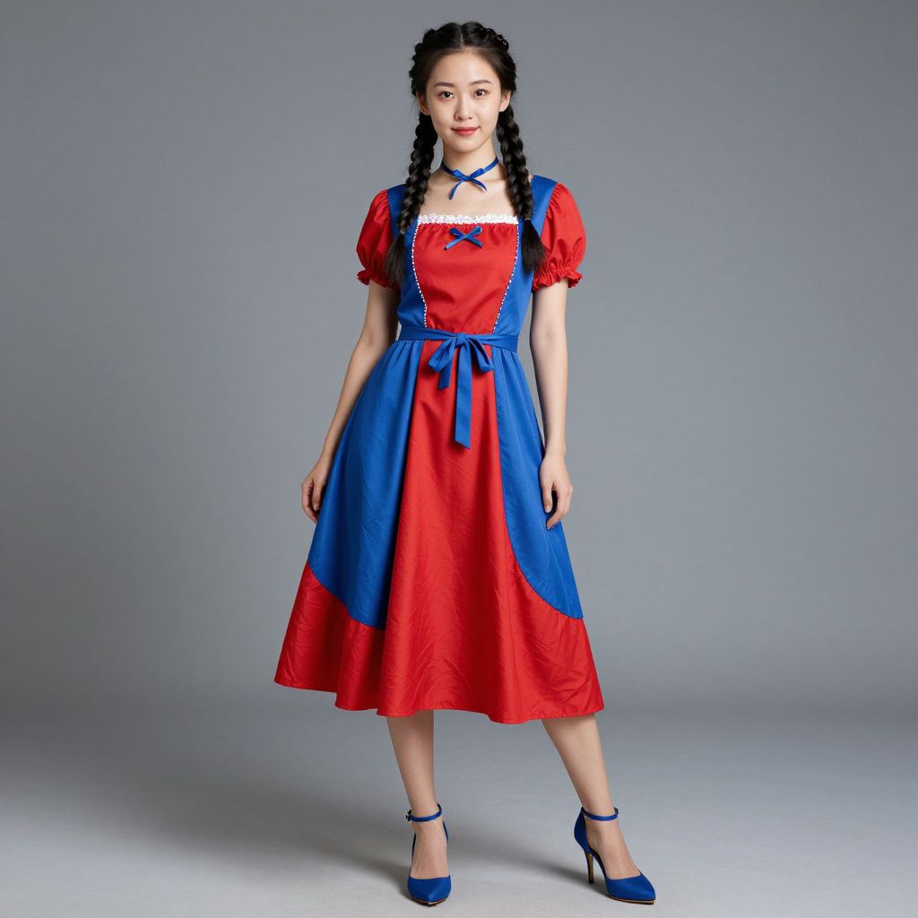 Photograph of an East Asian woman with fair skin and black braided hair, standing against a plain gray background. She wears a red and blue dress reminiscent of Snow White's costume, featuring puffed red sleeves, a red bodice with blue trim, and a blue apron. The dress has a white collar and a blue ribbon bow at the neck. She completes the outfit with blue high-heeled shoes. Her expression is neutral, and she stands with her arms relaxed by her sides. The lighting is even, highlighting the vibrant colors of her dress.